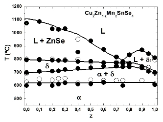 Se reporta el estudio estructural y el diagrama de fases del sistema de aleaciones Cu2Zn1-zMnzSnSe4. Las muestras policristalinas se sintetizaron utilizando la técnica de fusión directa y recocido a partir de los elementos constituyentes. El análisis por difracción de rayos-X indica que el sistema cristaliza en la estructura tetragonal estannita con grupo espacial I42m. A partir de los puntos experimentales del análisis térmico diferencial (ATD) se construyó el diagrama de fases del sistema, el cual sugiere que la región entre 600 y 700 ºC es bifásica coexistiendo las fases estannita y wurtz-estannita (α+β). La descomposición peritéctica del sistema δ→(L+ZnSe) en la región entre z = 0 y z ~ 0,80 ocurre ~ 800 ºC; para z > 0,80 la temperatura peritéctica disminuye hasta ~ 700 ºC a z = 1,0. La transición de líquido L a (L+ZnSe), está dada por la línea frontera entre 1075 ºC a z = 0 y ~ 770 ºC a z ~ 0,80. La región del diagrama por debajo de los 600 ºC corresponde a la aparición de la fase tetragonal estannita, como lo indica el estudio por difracción de rayos-X atemperatura ambiente.Descargas